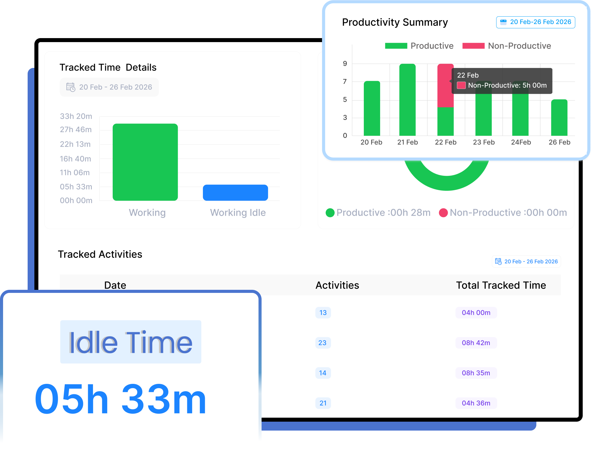 Separate productive work from non-productive hours with detailed activity tracking. See where time adds value and where improvements are needed, helping managers optimize schedules, balance workloads, and support better work habits.