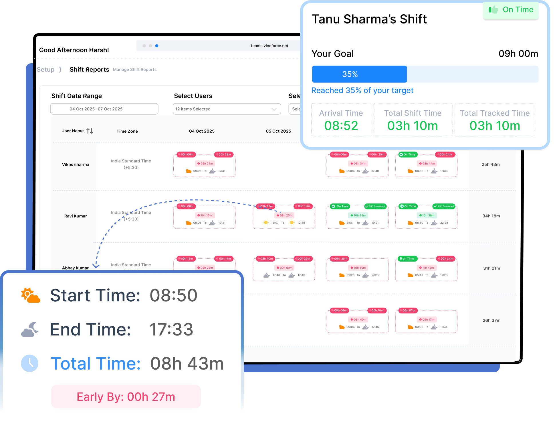- Shift compliance by reducing late logins, early logouts, and time gaps.